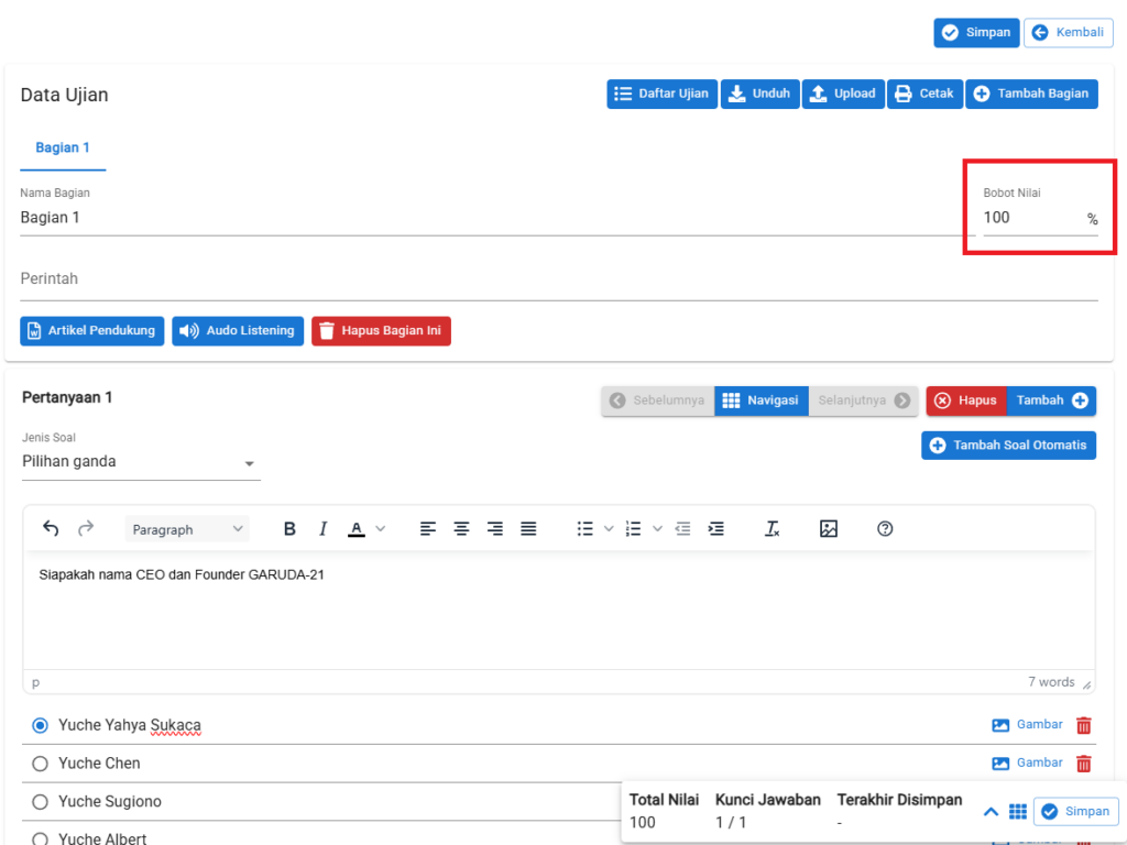 Ketika Nilai Otomatis aktif, pastikan sudah atur bobot bagian soal tersebut.